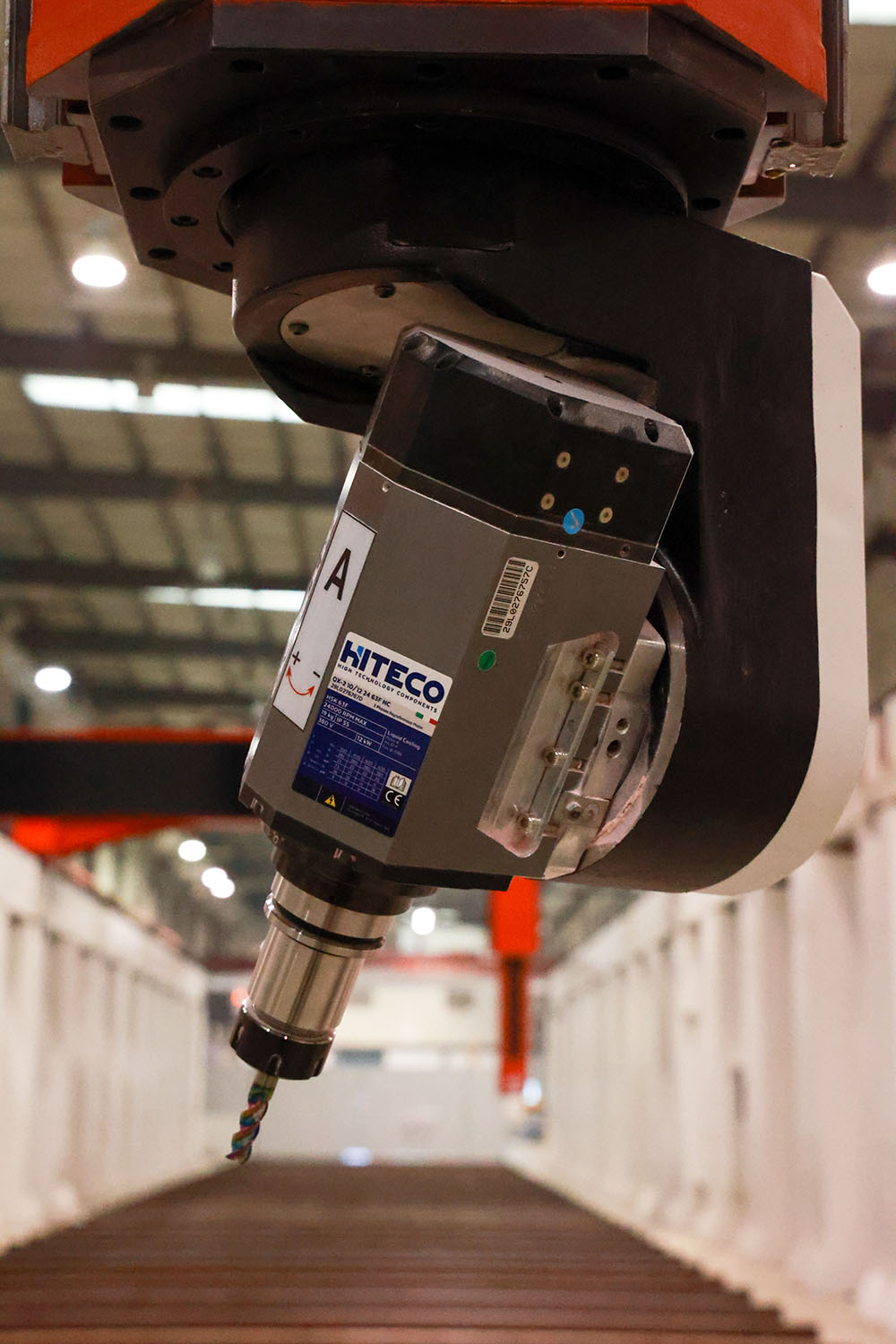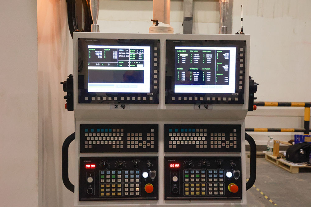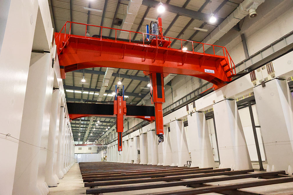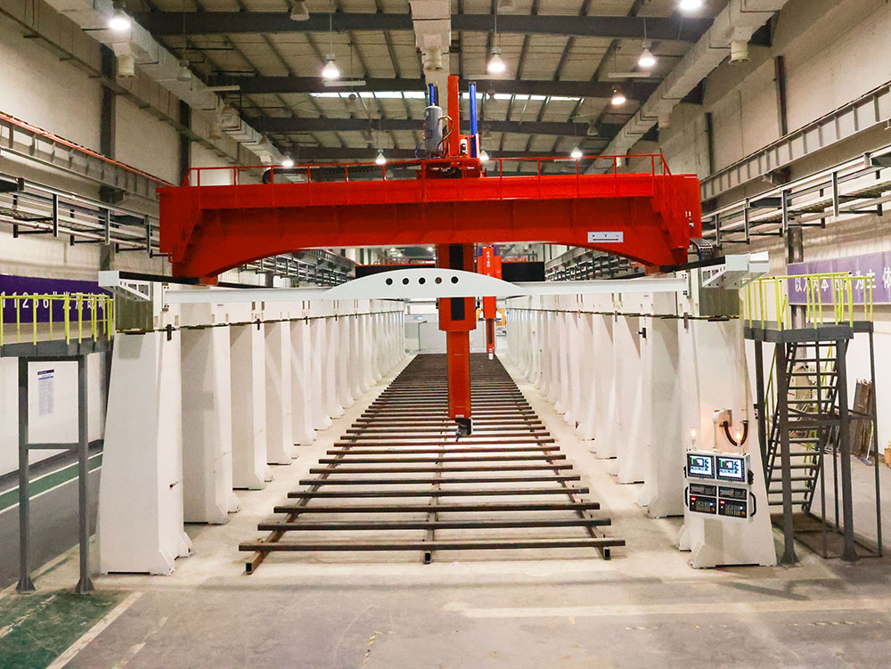 该机床主要由固定横梁2 组、动横梁2 组、左右立柱、拖板、润滑系统、冷却系统、导轨防护装置、电气控制系统等部件组成。其结构型式为动梁结构,机床的立柱分别安装床身的两侧,固定横梁固定在立柱上。横梁上配置拖板及五轴头。拖板连同主轴在横梁上左右作X 向运动。动梁沿固定横梁导轨前后作Y 向运动。五轴头在拖板上上下作Z 向运动,Z 轴作双节运动。